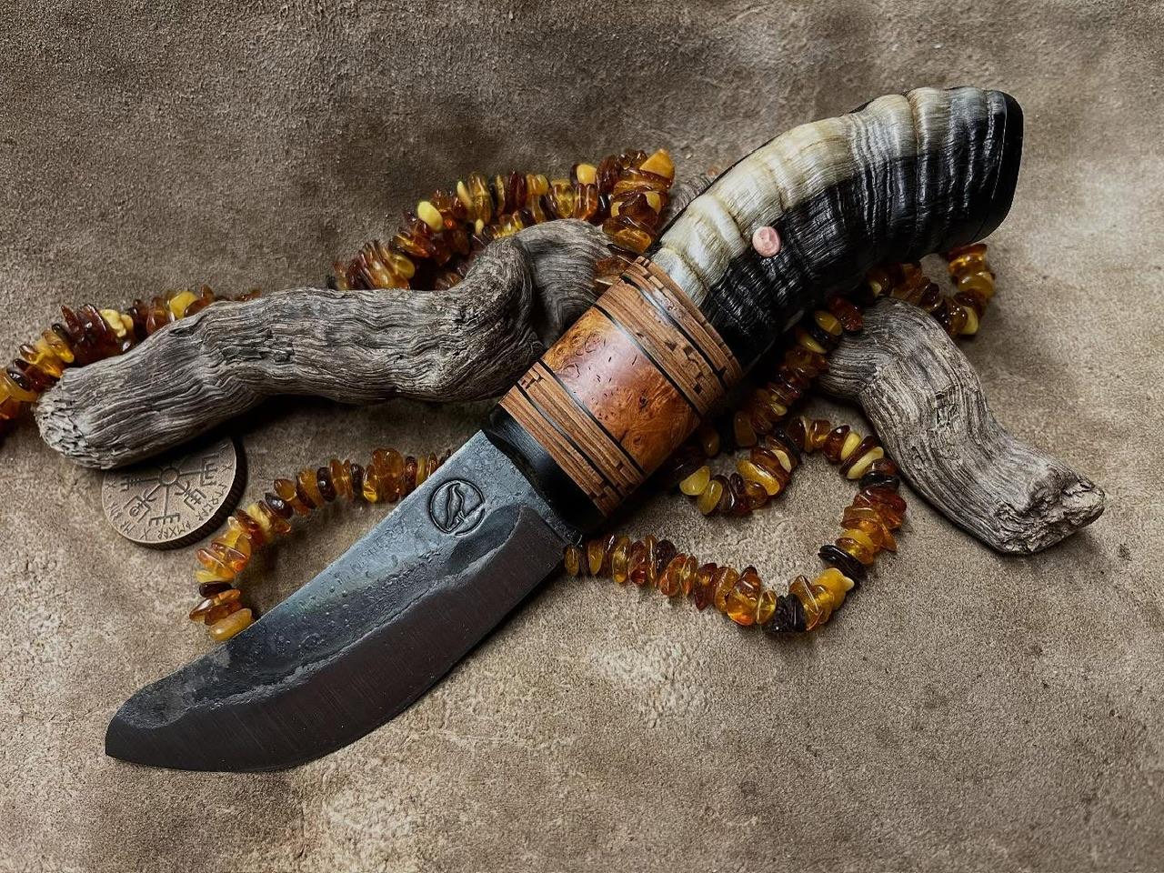 lame forgée dans un plat de XC75... plaquettes bouleau madré ----Dimensions : 160 mm pour 65 mm de lame --