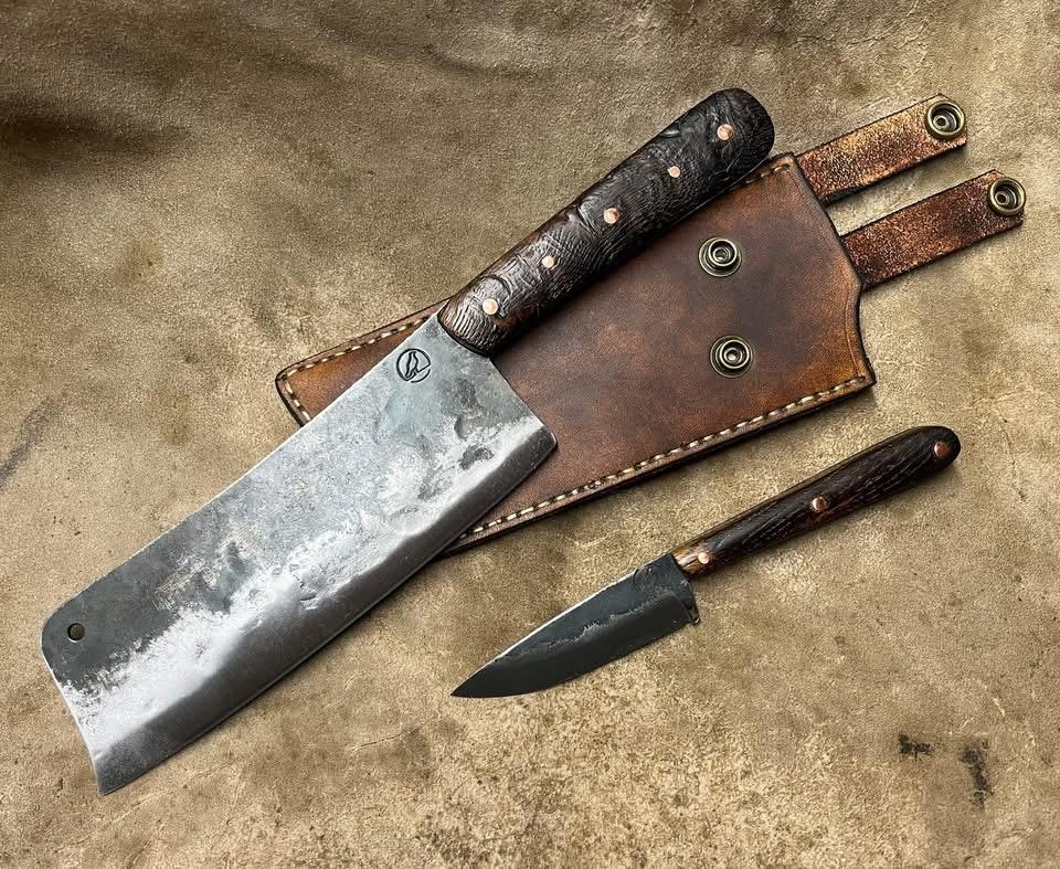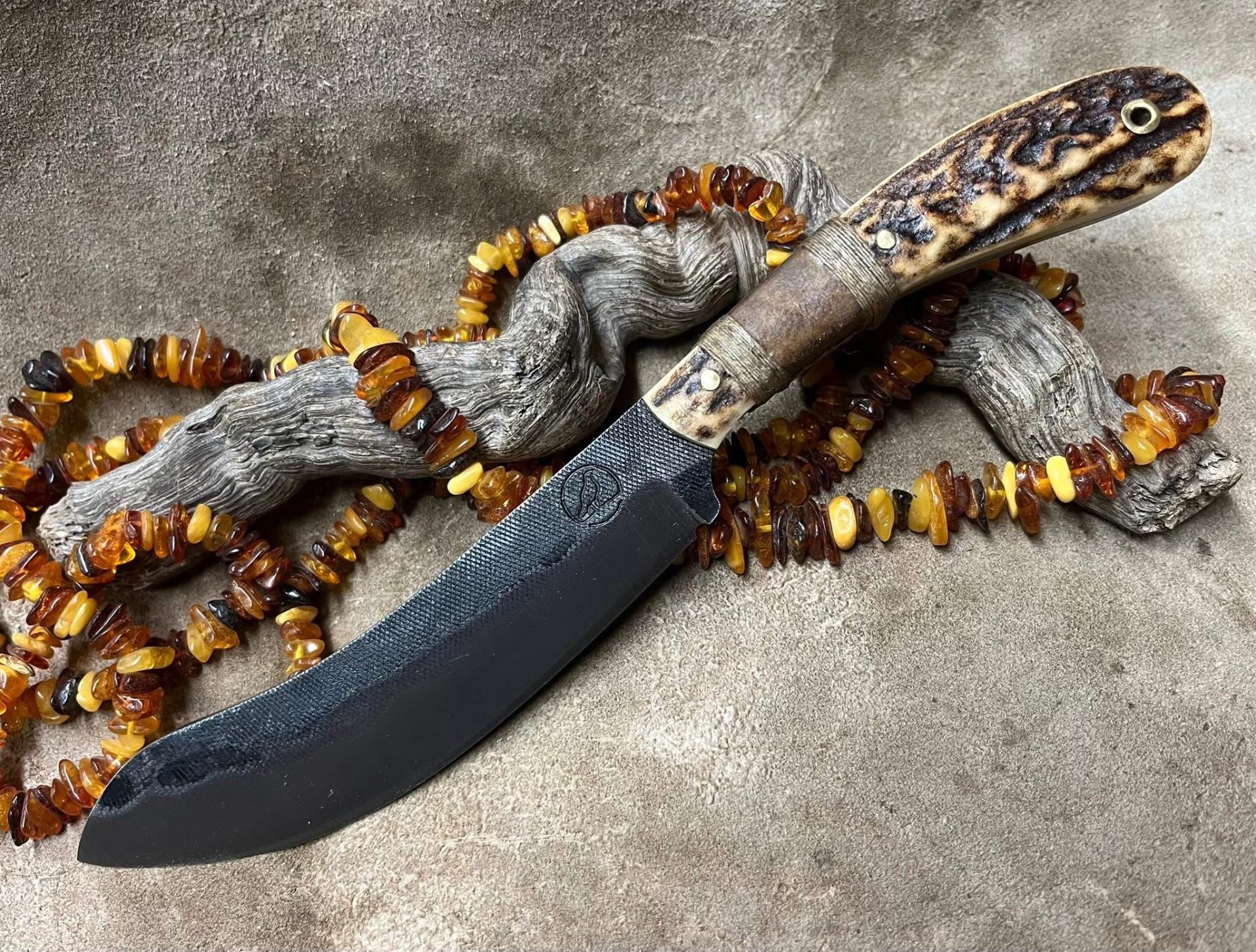 lame forgée dans un plat de XC75... plaquettes bois de cerf---Dimensions : 220 mm pour 110 mm de lame --