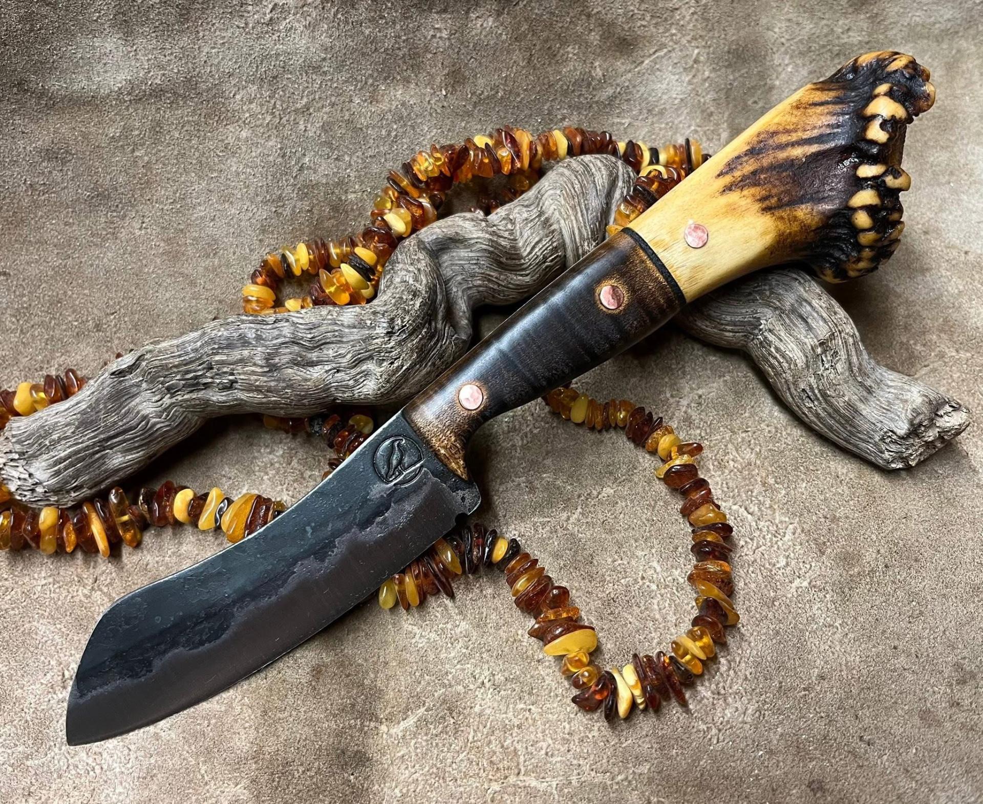 lame forgée dans un plat de XC75... plaquettes bois de cerf ----Dimensions : 160 mm pour 65 mm de lame --